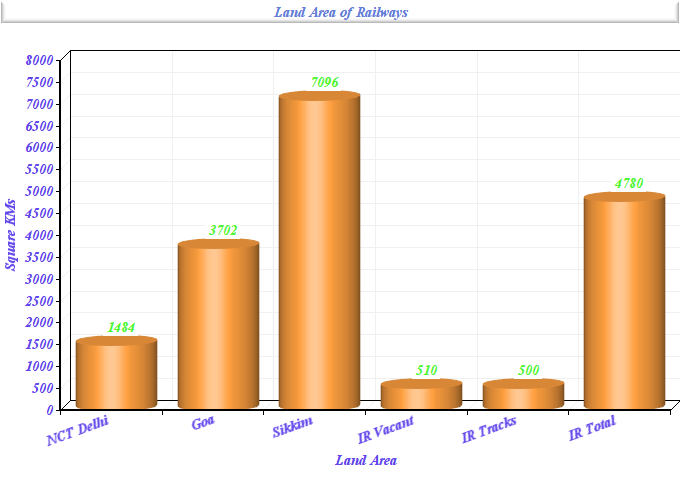 As far as land is concerned, the total land available with the Indian Railways is 4780 sqkm, out of which 510 sqkm land is vacant. This is a huge amount of land which could be more than some of the smallest states in India. For example that is 322% of NCT Delhi, 129% of Goa and 67% of Sikkim.